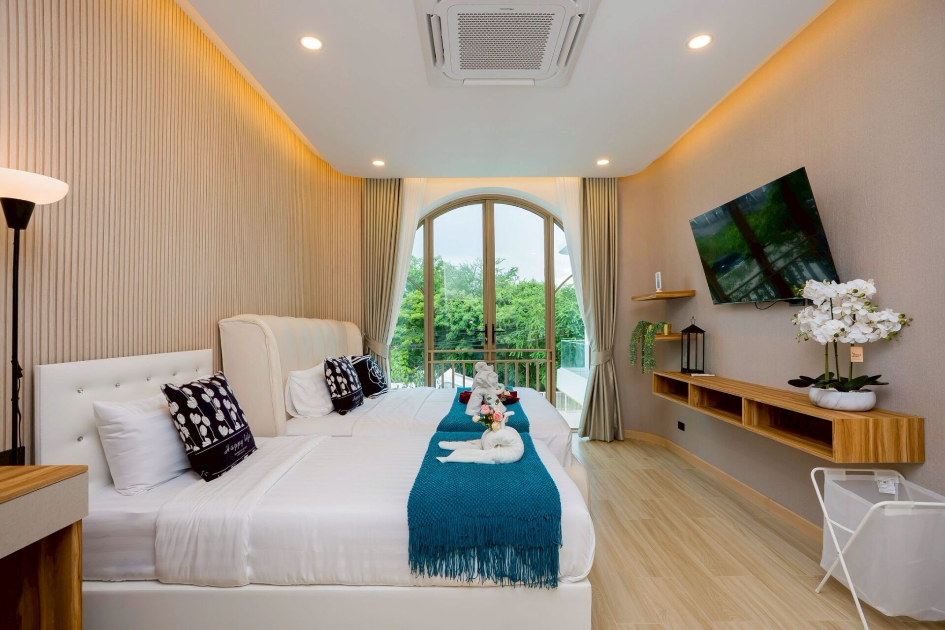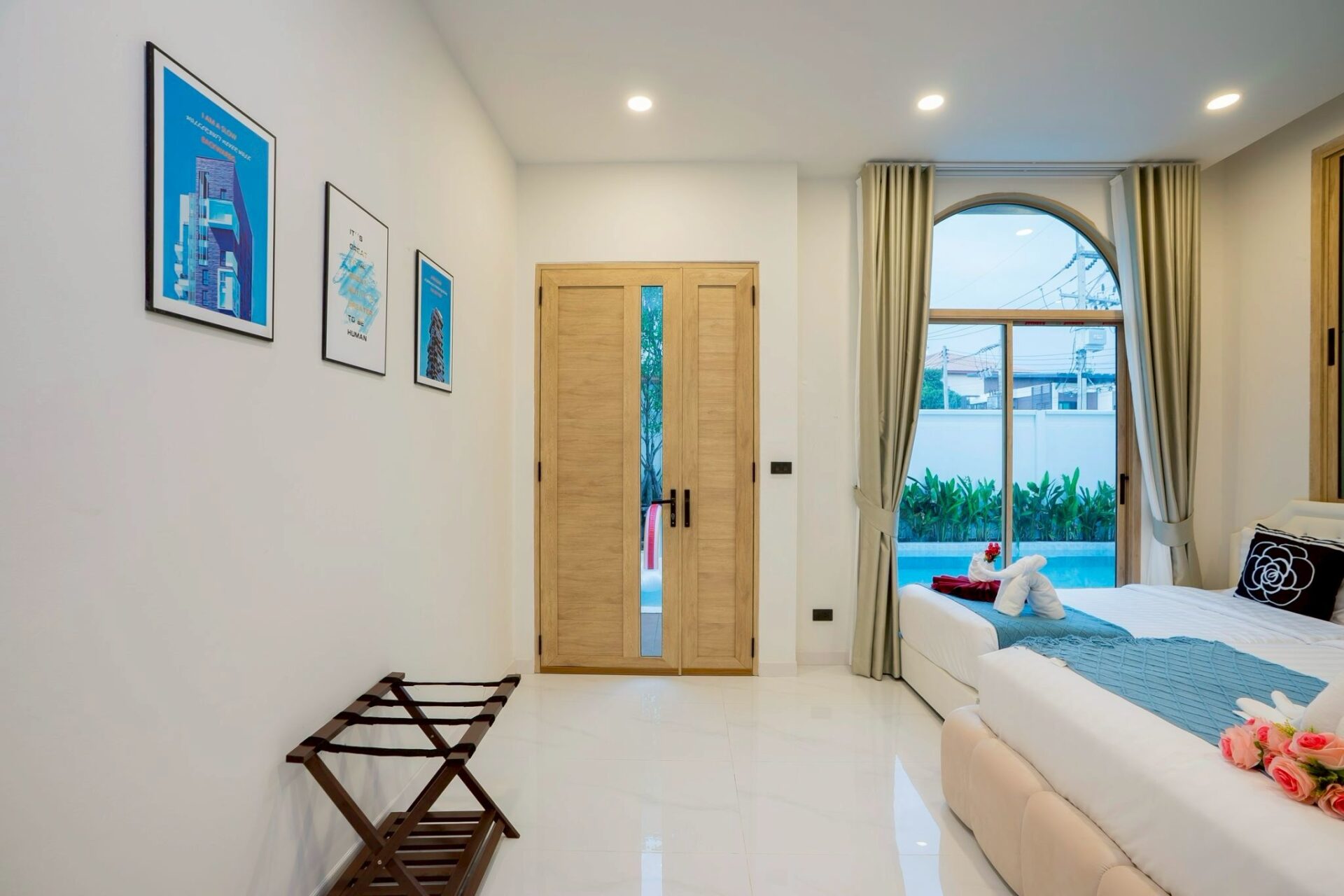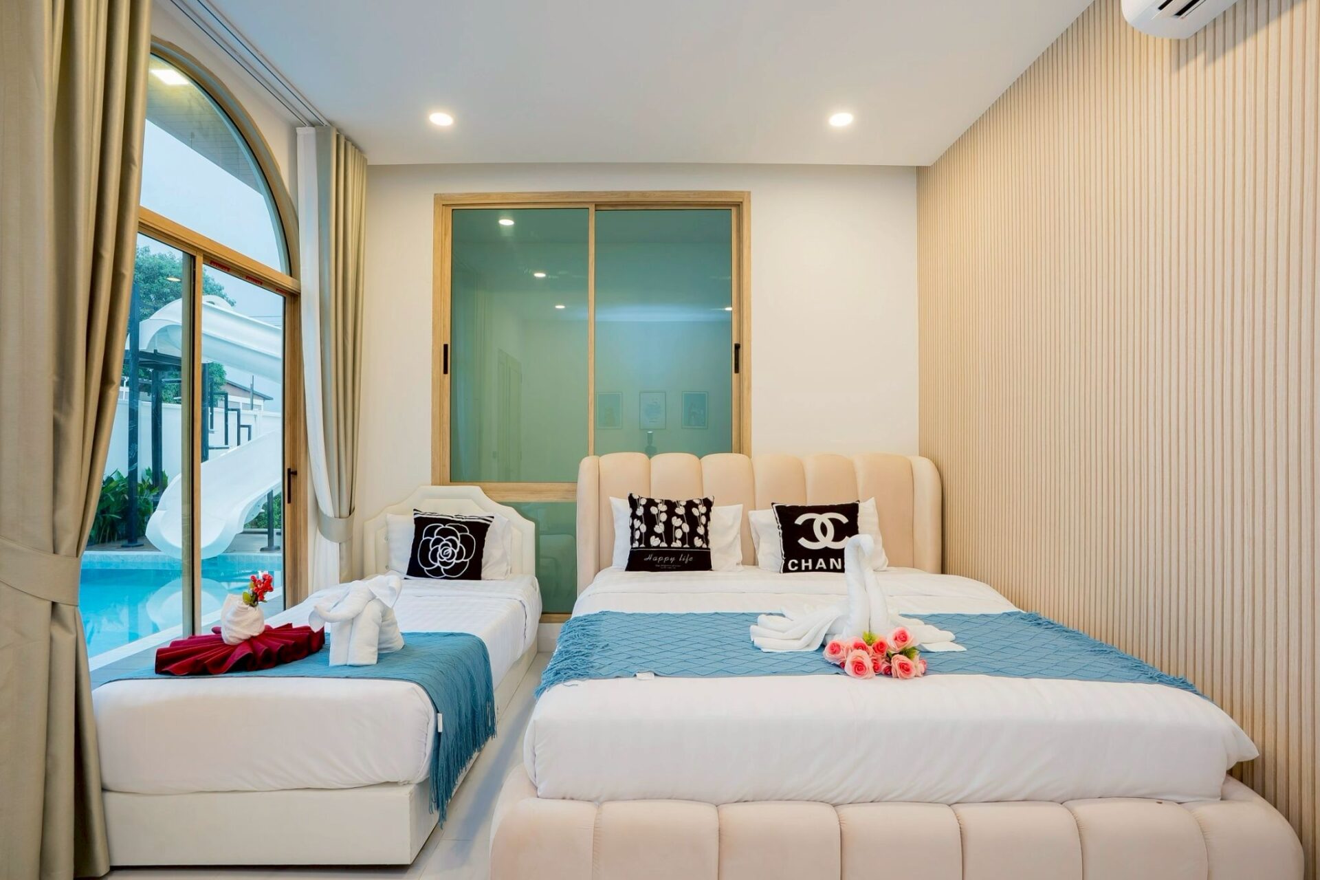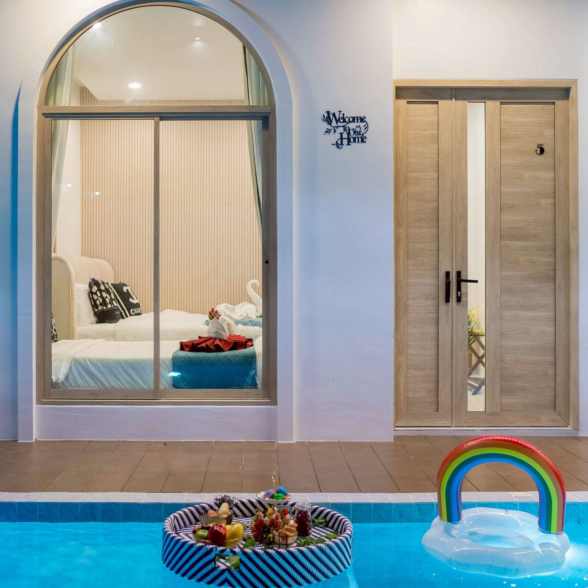 - ห้อง 4 หน้าสระน้ำ เตียง 6 ฟุต 1 เตียง + เตียง 3.5 ฟุต 1 เตียง (มีห้องน้ำในตัว)