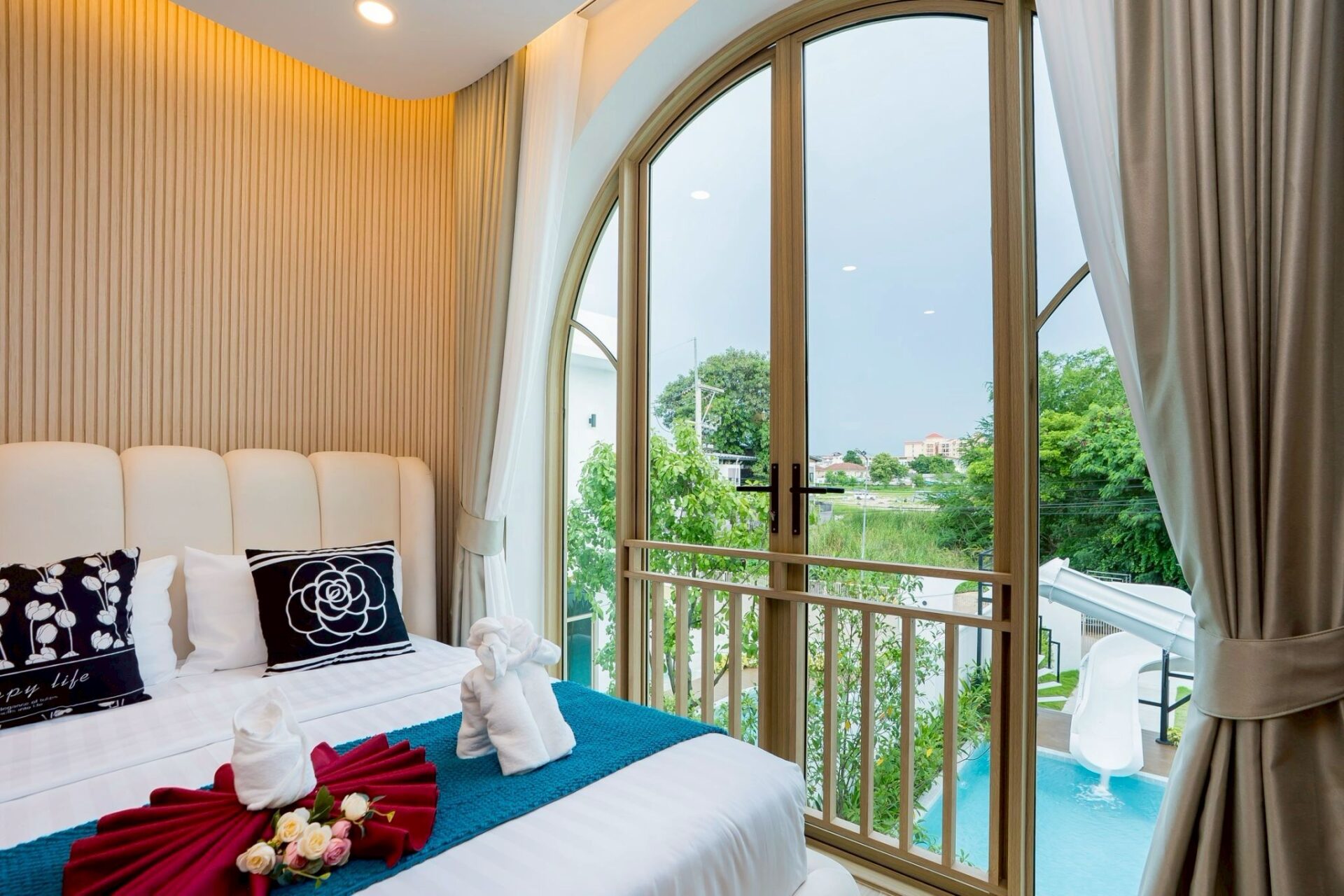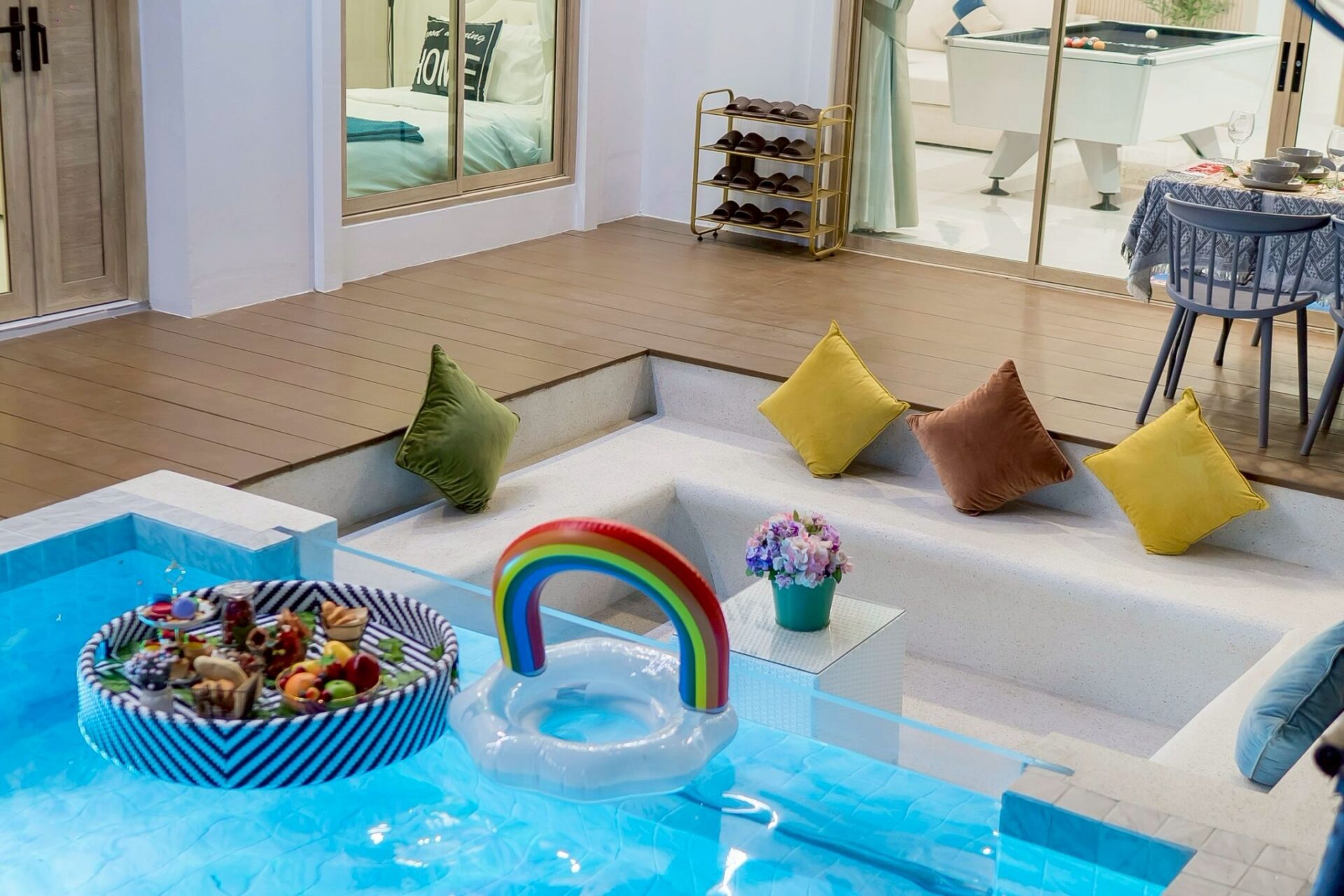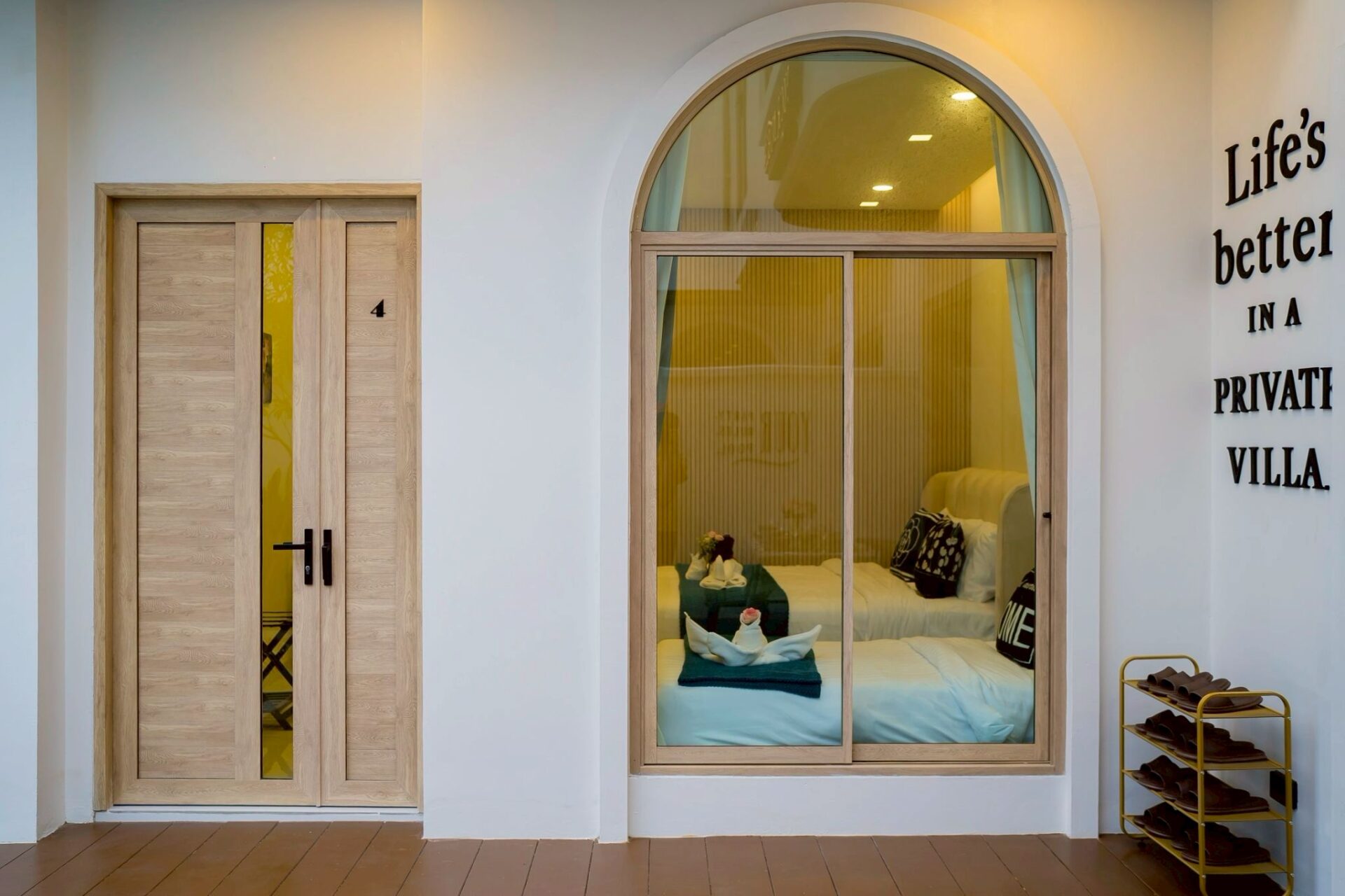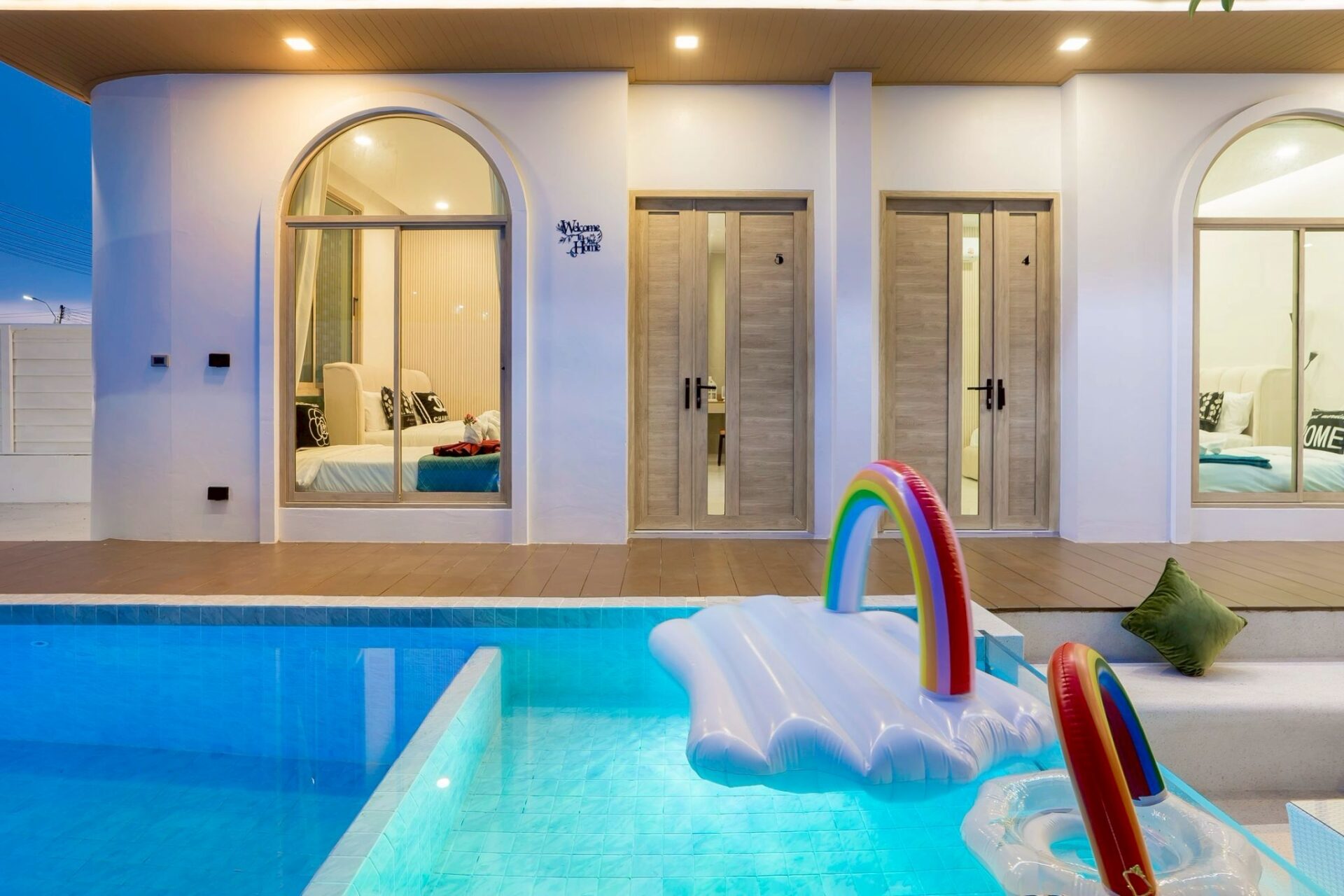 - ห้อง 4 หน้าสระน้ำ เตียง 6 ฟุต 1 เตียง + เตียง 3.5 ฟุต 1 เตียง (มีห้องน้ำในตัว)