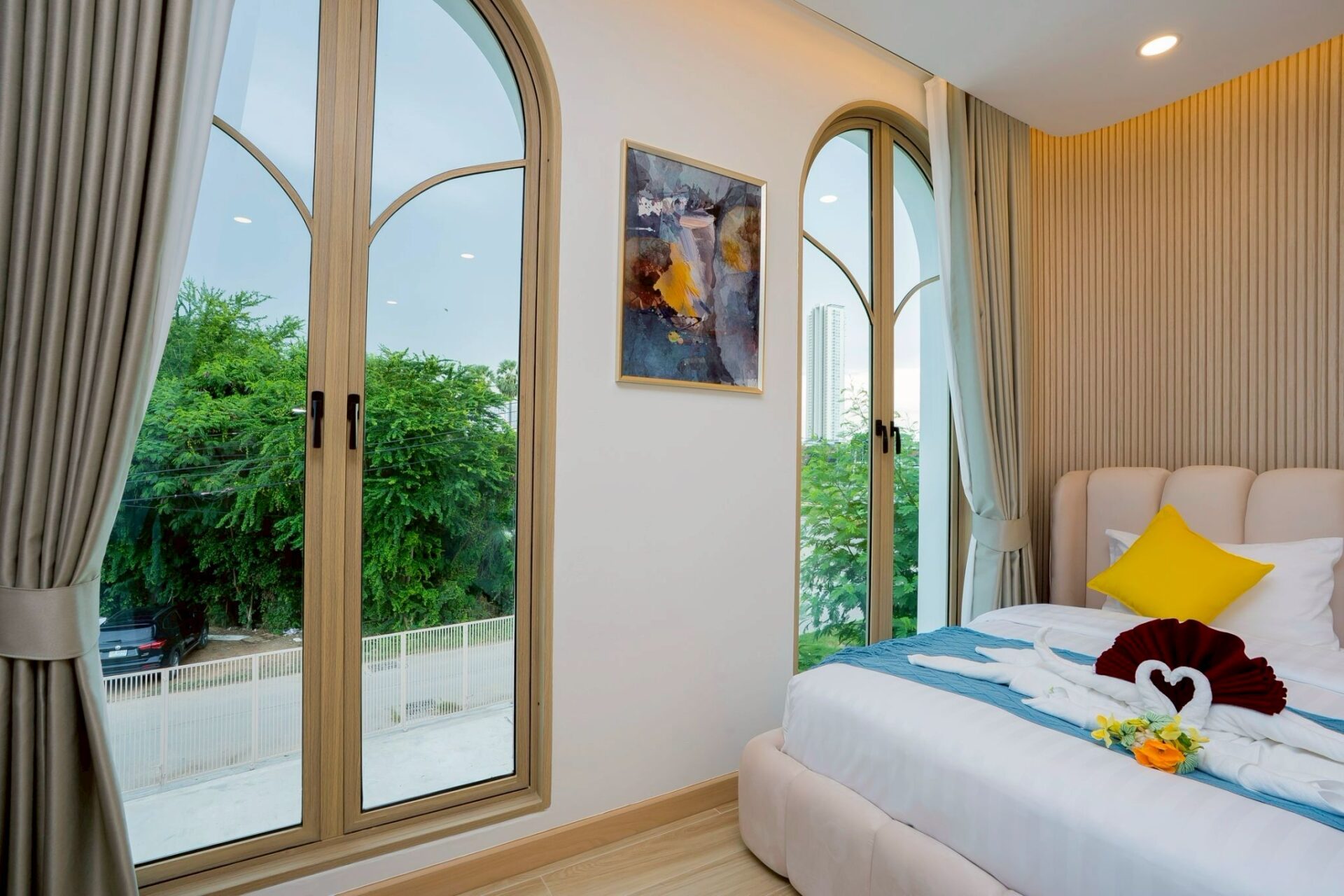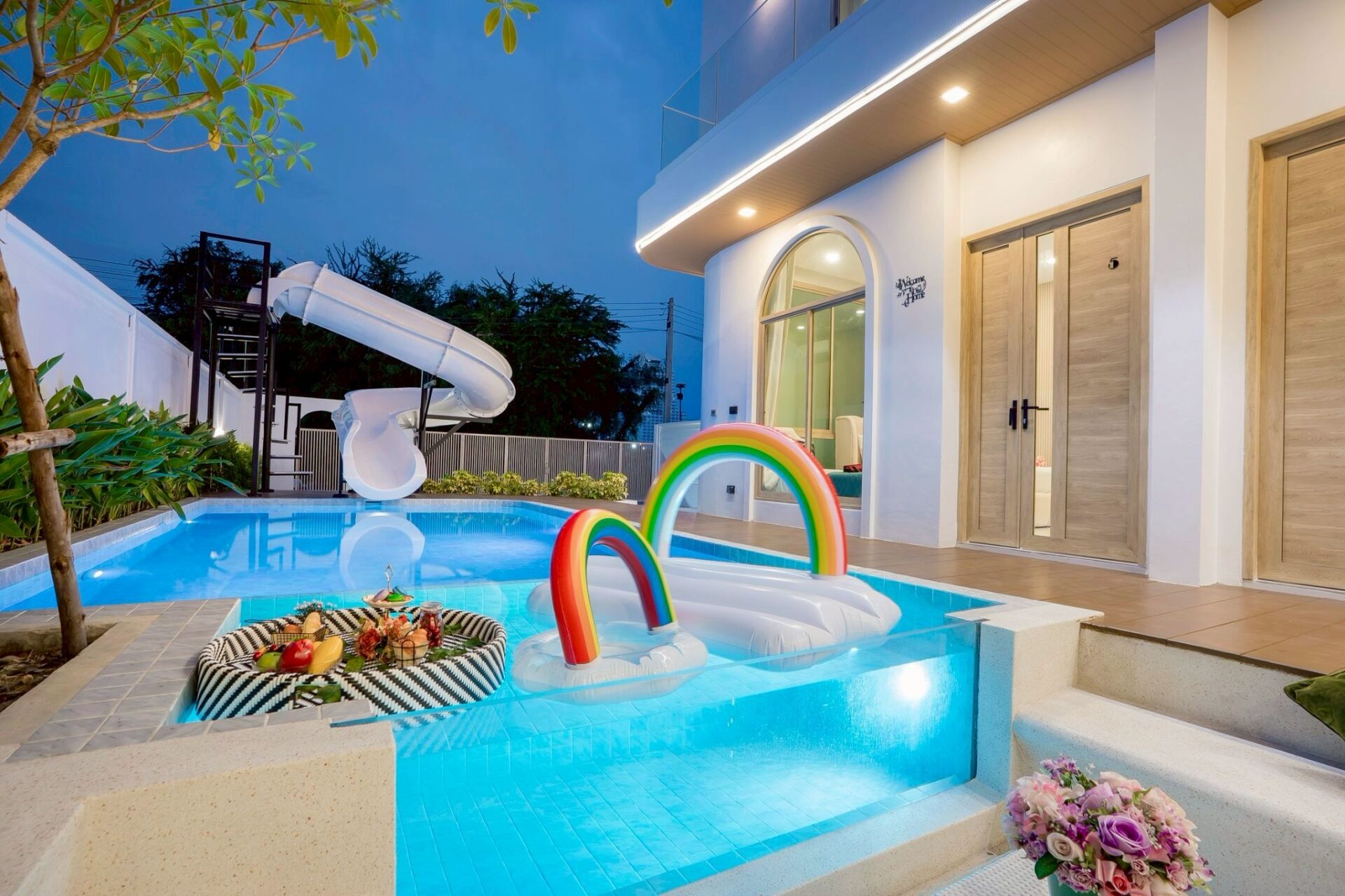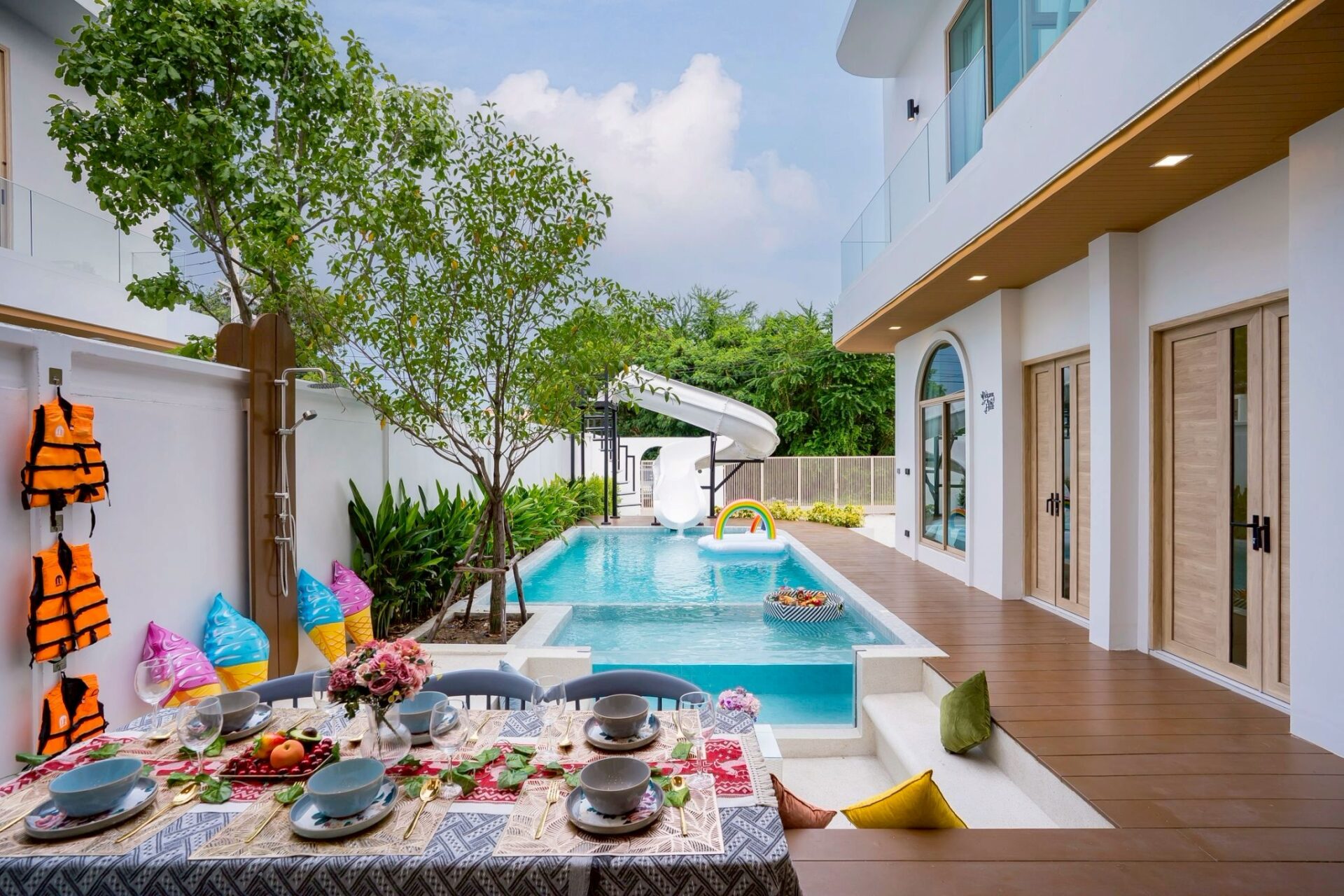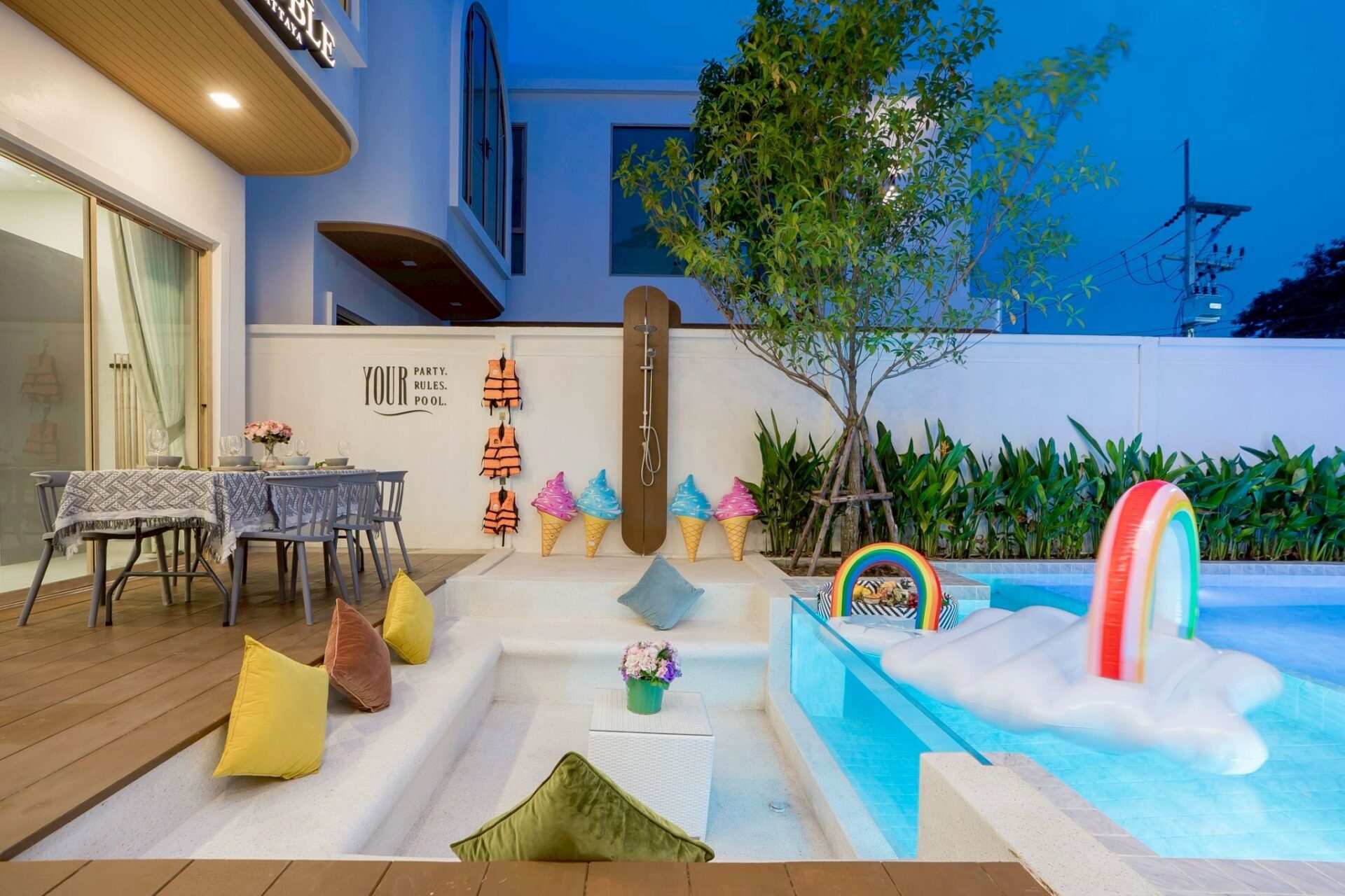 - ห้อง 4 หน้าสระน้ำ เตียง 6 ฟุต 1 เตียง + เตียง 3.5 ฟุต 1 เตียง (มีห้องน้ำในตัว)