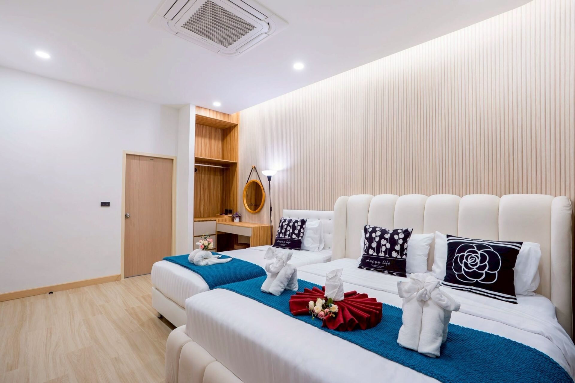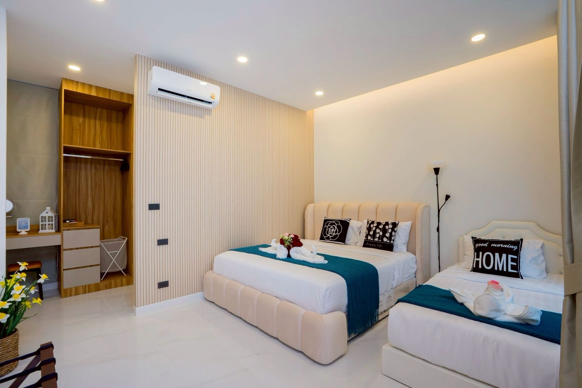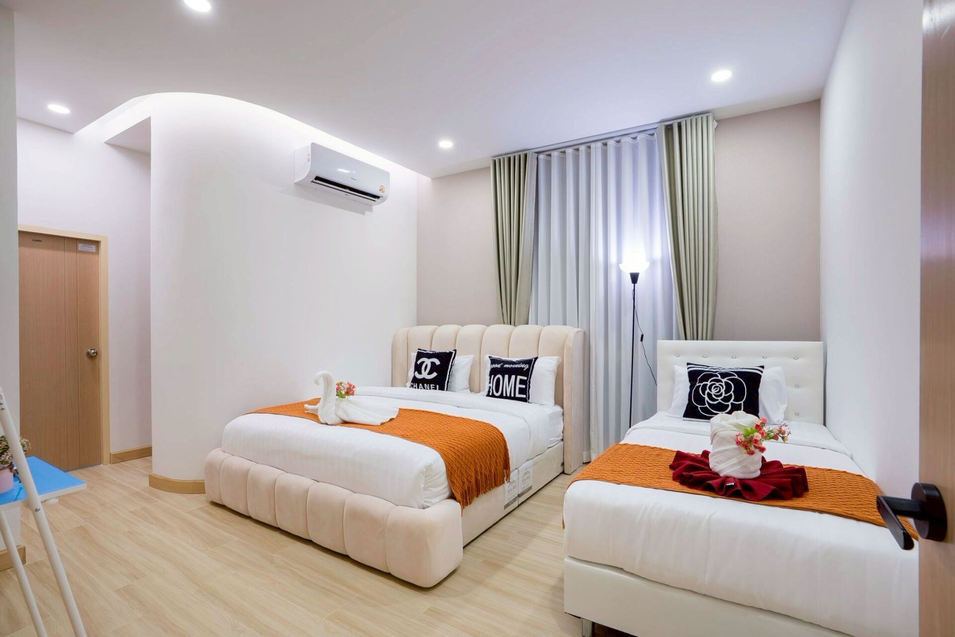 - ห้อง 3 เตียง 6 ฟุต 1 เตียง + เตียง 3.5 ฟุต 1 เตียง (มีห้องน้ำในตัว)